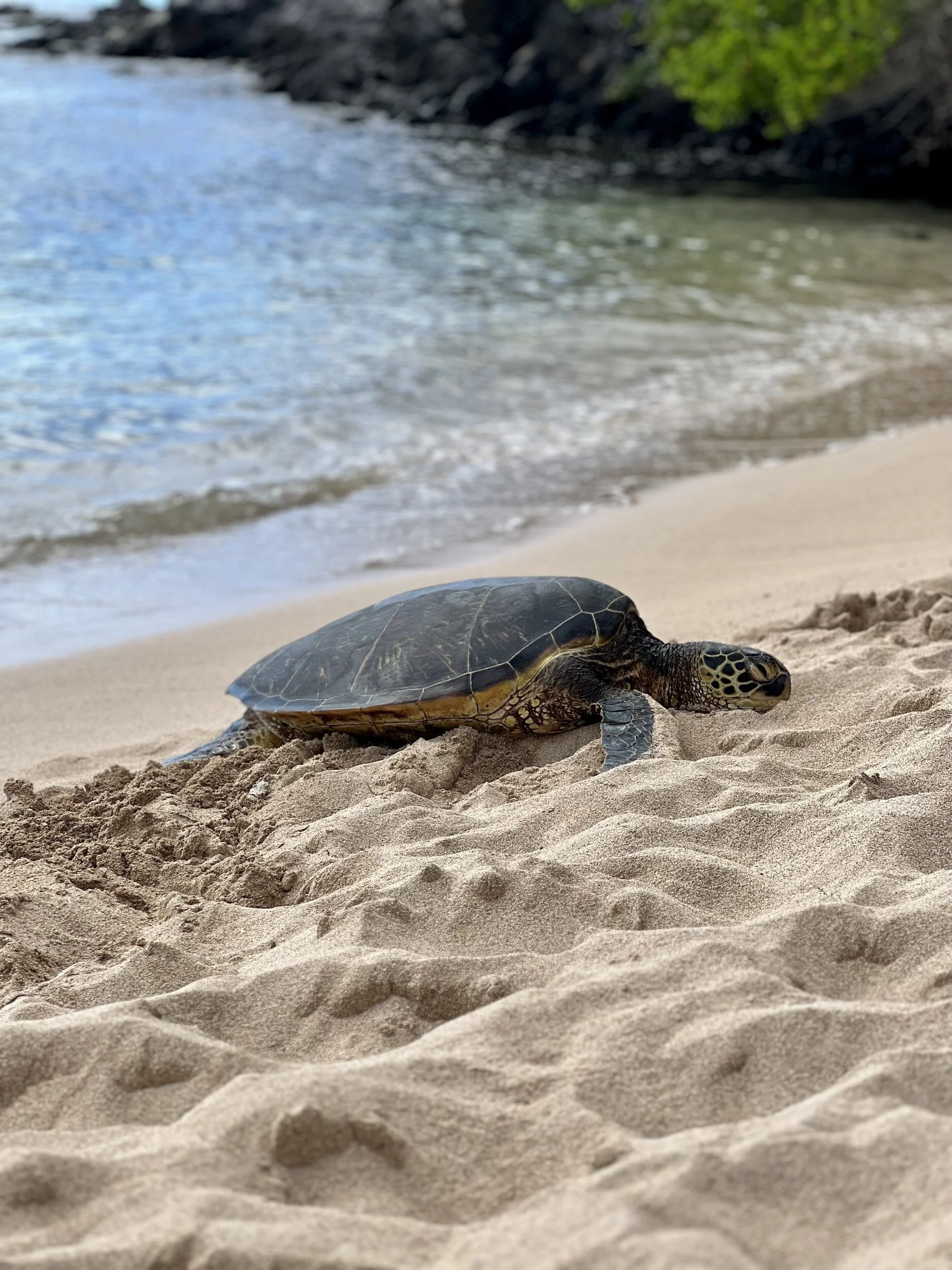 On our way back, my mom pointed at some fresh tracks in the sand and asked if this is what sea turtle tracks looked like. Yes, I said, and then she noticed that a couple of feet ahead, there was a green sea turtle (people here call these giants greenies) walking up the hill to dig a nest. We followed her quietly and watched her looking for the right spot before digging a nest and laying over 100 eggs in it. It was the most magical hour. When the greenie had finished laying her eggs and had covered the nest carefully, we walked behind her as she made her way back to the ocean. We stood there, overwhelmed with excitement at witnessing this amazing event. As the waves carried her back into the depths of the ocean, we began to walk back home.
